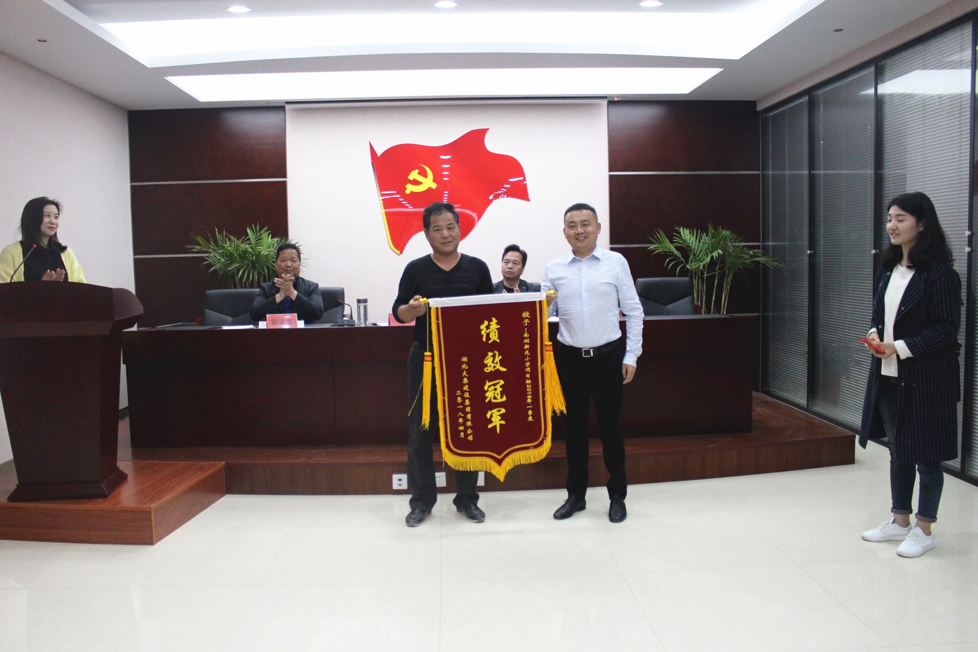 會議開始,由人事行政部公布第一季度績效考評結果,董事長徐濤親自向一季度績效冠軍——南湖(新光)小學項目頒發(fā)10000元獎金。