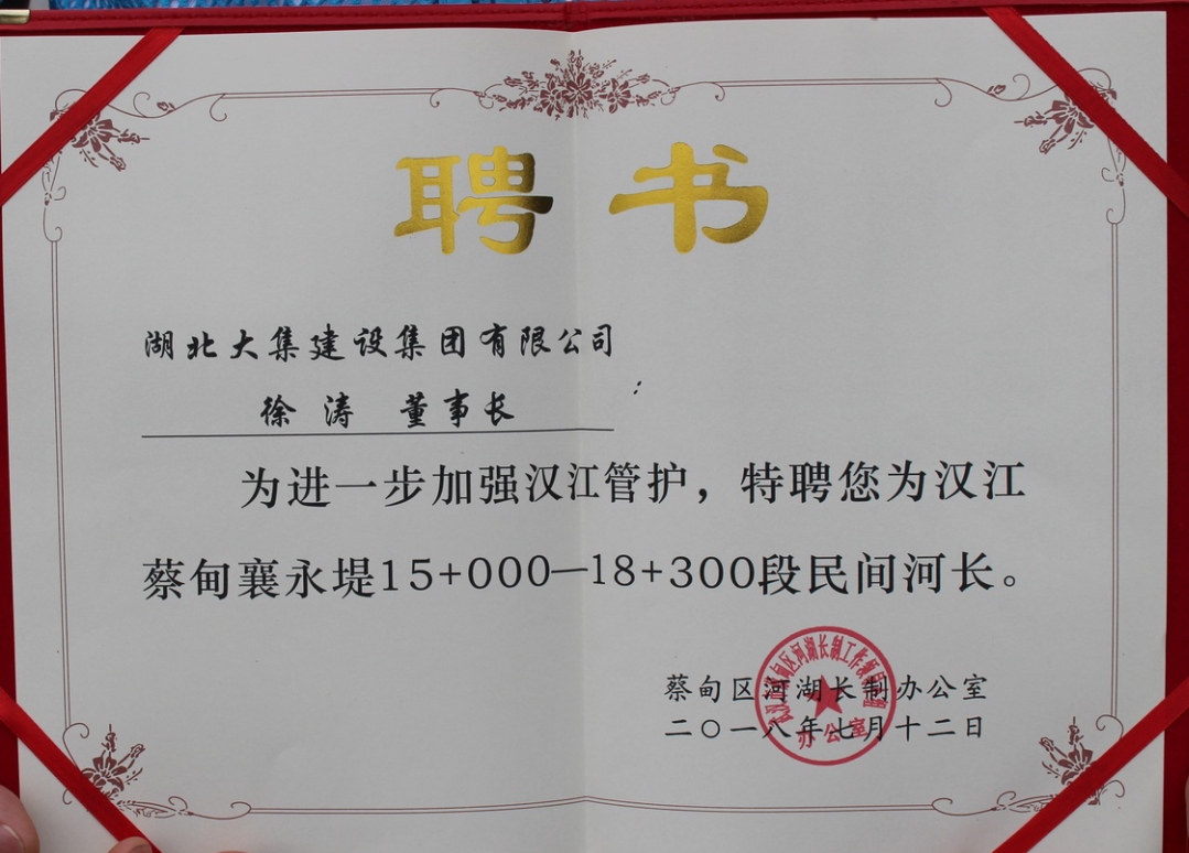 水是生命之源、生產(chǎn)之要、生態(tài)之基。為貫徹落實習近平總書記視察湖北的重要講話精神,進一步加強河湖管理和保護工作,7月12日,蔡甸區(qū)漢江民間(企業(yè))河長履職啟動儀式于蔡甸區(qū)江灘公園隆重舉行,湖北大集建設(shè)集團董事長徐濤受聘為漢江蔡甸襄永堤15+000—18+300段民間河長。