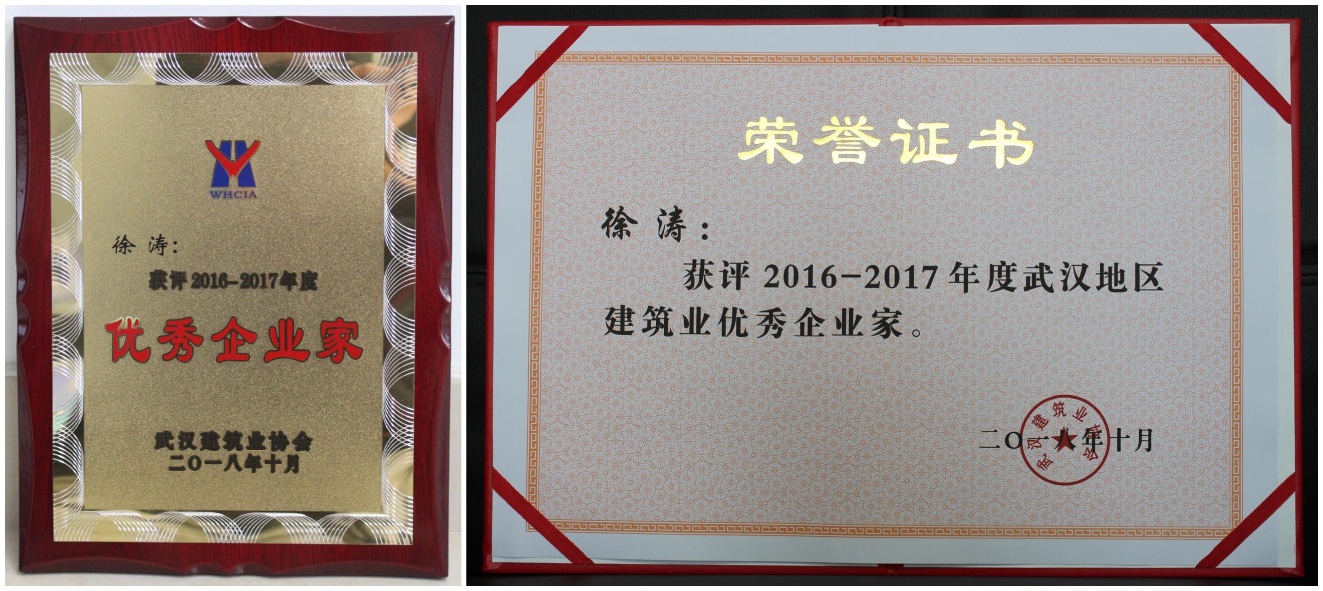 董事長徐濤榮獲“2016-2017年度武漢地區(qū)建筑業(yè)優(yōu)秀企業(yè)家”稱號
