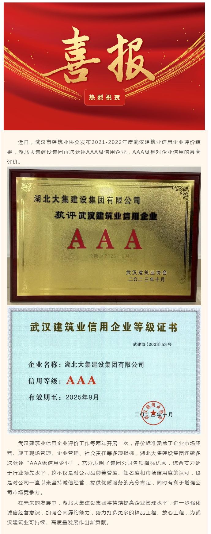 喜報(bào)!湖北大集建設(shè)集團(tuán)再次獲評(píng)“武漢建筑業(yè)AAA信用企業(yè)”